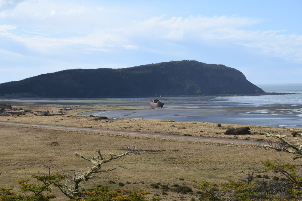 Pero antes hacemos nuestra última excursión en Tierra del Fuego, por la carretera A (de grava y tierra, por supuesto) en la costa atlántica, hacia el cabo San Pablo, donde hay un carguero embarrancado desde el año 1985. Todavía llueve, por lo que la carretera parece un barrizal. El lugar es muy bonito, hay un faro en lo alto al que se puede llegar en 45 minutos de caminata (que no hacemos porque sigue lloviendo) y hay muchas aves a la vista (hay marea alta). Pero con la que está cayendo, cualquiera saca la artillería para fotografiarlas. Seguimos por la carretera hasta su final, con la esperanza de que entretanto deje de llover. Y no solo deja de llover, si no que incluso sale un sol espléndido. Volvemos al cabo San Pablo a ver el barco.
