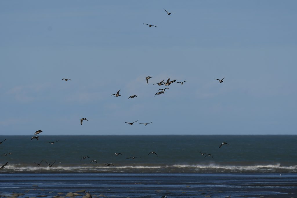 La marea está bajando y las aves están bastante lejos de la costa ☹. Hay que tener cuidado, porque en este cabo, el mar retrocede 11 km en la bajamar. No hay que adentrarse demasiado en la playa persiguiendo pájaros. La ventaja es que se puede observar el barco desde todos los ángulos.