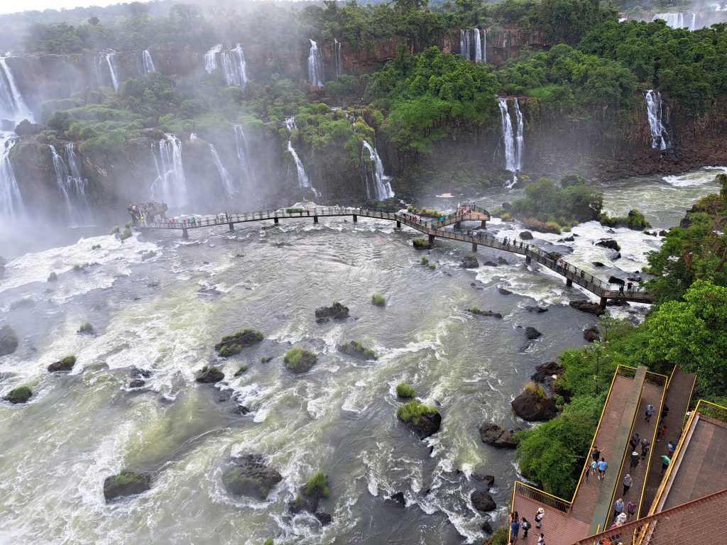 Der brasilianische Teil des Parks ist ganz anders gestaltet als der argentinische. Hier wird man zusammen mit einer geführten Gruppe mit dem Bus zum „Einstieg“ in den Pfad gegenüber vom Hotel gebracht und auf der anderen Seite wieder abgeholt. Auf der brasilianischen Seite liegen zwar nur 20% der Wasserfälle, aber der Blick auf die argentinische Seite ist gigantisch. Und auf dem Steg vor der Garganta del Diablo wird man fast genauso nass, wie auf den Booten.
