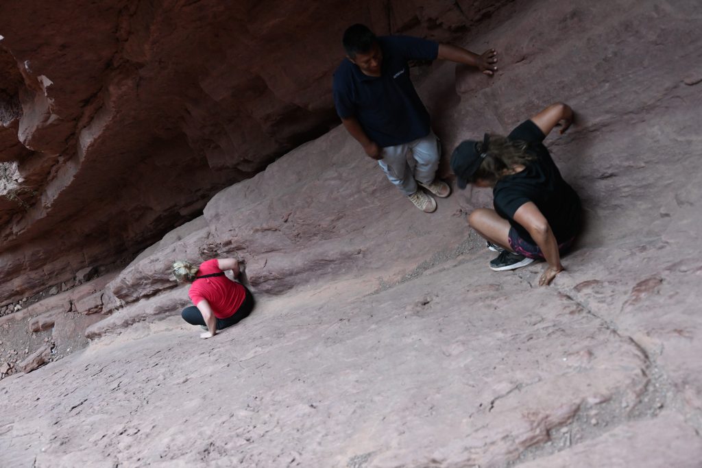 Nuestro guía, Raul, indicando a las chicas como bajar por la rampa de una forma poco honrosa