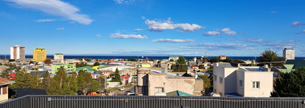In Punta Arenas leisten wir uns ein relativ luxuriöses Hotel und wir genießen das extrem leckere Frühstück. Es gibt sogar eine Nespresso-Maschine und ich trinke den ersten richtigen Cappuccino seit unserer Ankunft auf diesem Kontinent. Auf dem Dach des Hotels gibt es ein rundrum verglastes Terrassenzimmer, von dem man einen schönen Blick auf den Hafen und über die Stadt hat.