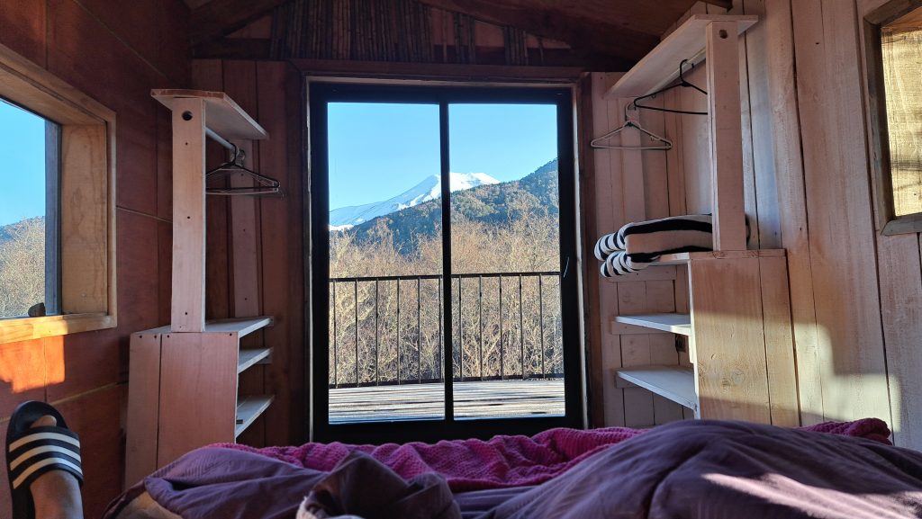 Nos alojamos dentro del Parque Nacional en unas cabañas ecológicas en medio del bosque (La Baita Conguillio), muy amplias y cómodas, con agua caliente y todo, pero con calefacción de estufa a leña y sin cobertura móvil ni WiFi. El problema de las estufas a leña es que al cabo de unas pocas horas se apagan, con lo que al levantarse por la mañana hace un frío que pela. Tened en cuenta que las mínimas por allí eran de un par de grados bajo cero.