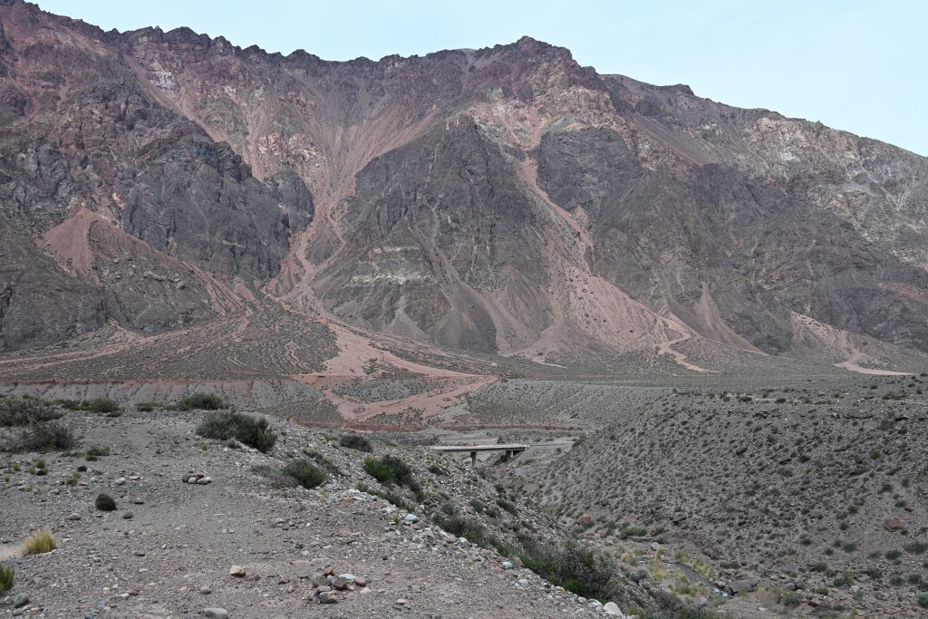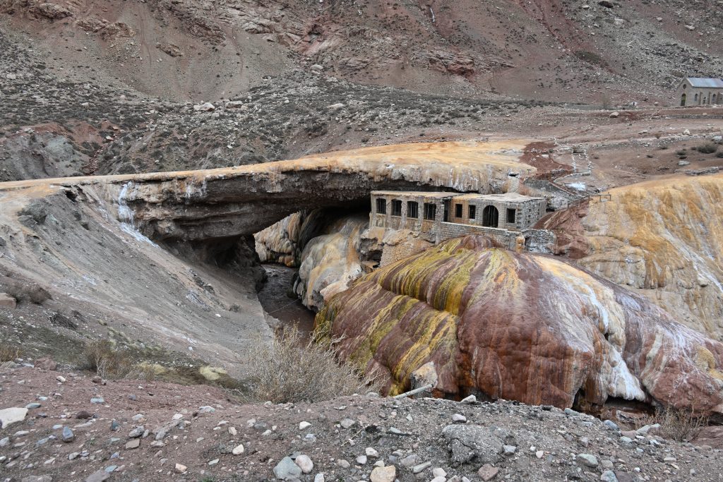Los otros días visitamos las atracciones del tramo final de la RN 7, un par de puentes antiguos (puente Picheuta, puente sobre el río Colorado), un puente natural formado por el efecto de aguas sulfurosas llamado el Puente del Inca (y antigua zona termal de baños donde se podía llegar sólo en ferrocarril allá por los años 20 del siglo pasado) y los primeros kilómetros del sendero al Aconcagua. No pudimos subir por la antigua y delirante carretera del paso (ahora hay un túnel) hasta sus 4000 metros de altitud para ver el Cristo Redentor y su paisaje por exceso de nieve (de todas formas, con el coche sin ventilador tampoco lo hubiéramos conseguido).