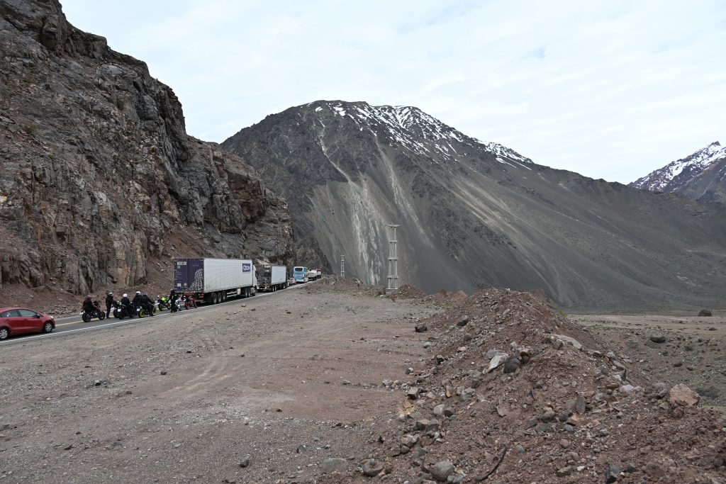 Normalmente tiene bastante tráfico, pero este fin de semana es infernal. A ello se une el curioso método de control de tráfico de los argentinos. El control policial se encuentra a unos 37 km de la frontera y la aduana a unos 10 km de la frontera. En los últimos 30 km de la RN 7 se encuentra varios atractivos turísticos, como la estación de esquí Los Penitentes, El Puente del Inca, el Parque Natural del Aconcagua y Las Cuevas con el Cristo Redentor. Todo el que visita estos lugares (nosotros) sin pasar la frontera, tiene que sufrir la caravana que se crea en el control policial (7 km el primer día, 5 el segundo). Es absurdo, es borgiano, es La Argentina.