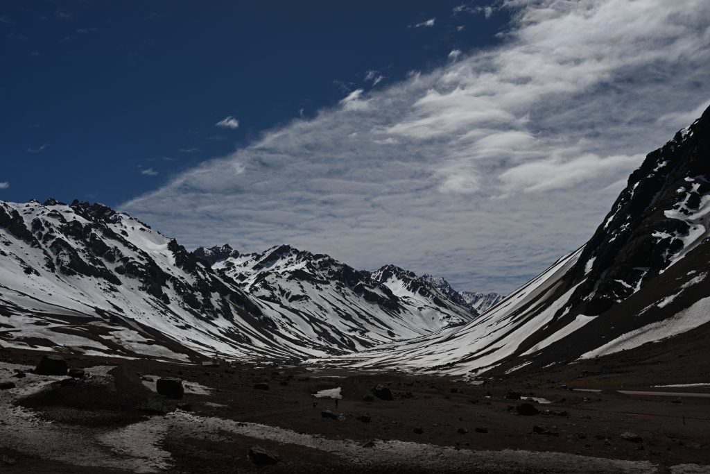 Detrás se encuentra Chile. A la izquierda se puede apreciar un tramo de la carretera de subida al Cristo Redentor. La foto se ha tomado a 3500 metros de altura.