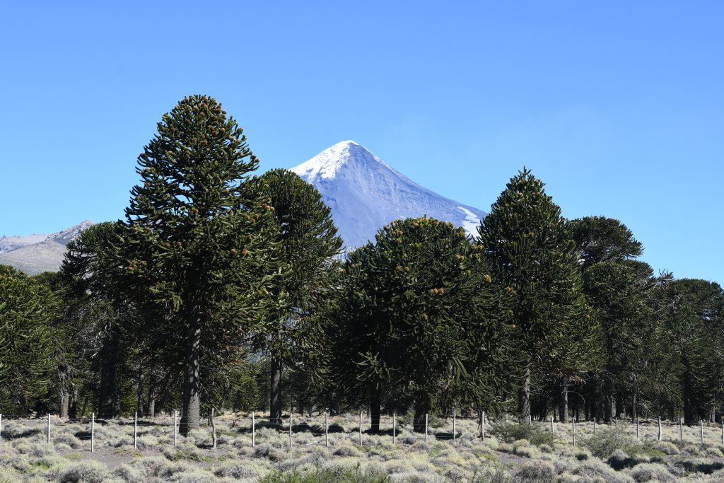 Discutimos la situación y decidimos probarlo una vez más. Así que nos dirigimos hacia el Paso Tromen, pasando por Junín de los Andes, el PN Lanín (con el volcán del mismo nombre) y ya en Chile, por el PN Villarrica con los volcanes Villarrica y Quetrupillán. El paisaje es precioso. En el PN Lanín pasamos por un bosque de araucarias, un fósil viviente que todavía medra por estos lares. Sus frutos, que parecen piñones del tamaño de un pulgar, sólo pueden ser recolectados en Argentina por individuos del pueblo Mapuche, ya que forma parte de su dieta básica y está considerado como un regalo de sus dioses.