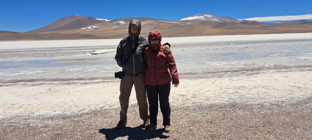 En el mirador de la laguna Brava estábamos a más de 4400 m.s.n.m. A esas alturas, hay personas que empiezan a sentir los efectos de la baja presión atmosférica. Marita, por ejemplo, tenía una ligera sensación de mareo. Independientemente de la altura, el frío que hacía sumado al fuerte viento reinante, no invitaba a permanecer mucho tiempo fuera del vehículo. Bendita estrechez.