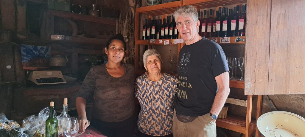 Allí nos encontramos con Nelly y una de sus nietas, que nos explican como están intentando conservar la aldea con producción ecológica de productos tradicionales e invirtiendo parte de las ganancias en educación para los jóvenes. Estuvimos bastante rato charlando con ellas y al final nos pidieron que Marita contestara en alemán a algunas preguntas que le haría Nelly y que yo las tradujera al castellano mientras nos grababan. Para el Instagram, nos dijeron. Fue divertido. Por supuesto que compramos algunos de sus productos, incluyendo una botella de vino rosado.