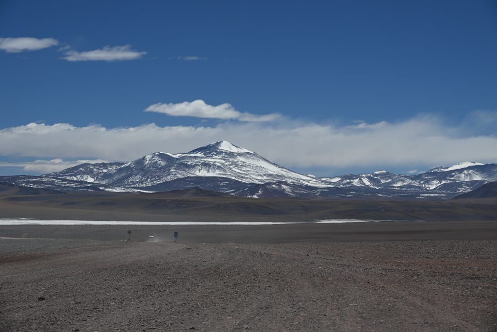 El volcán Incahuasi (6640 m) visto desde los 4400 m de altura. En la parte baja, se puede ver la Laguna Brava.