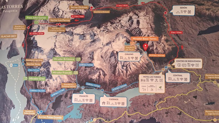 Nuestro plan para los próximos 7 días es realizar un circuito “corto” de casi 90 km y unos 4000 metros (calculo yo a ojo de buen cubero) de desnivel acumulado. La llaman la Ruta W por la forma (marcada en azul en la foto). Se puede hacer entre tres y cinco días, pero nosotros hemos añadido dos días más para tener algún periodo de recuperación. Así sobre el papel me da la impresión de que nos vamos a aburrir con tanto descanso. He reservado pernoctaciones (2 noches en litera en habitaciones compartidas con ropa de cama incluida y 4 noches en tiendas V.I.P. con colchonetas y sacos de dormir) para no tener que llevar el peso adicional. Sin embargo, sólo he conseguido reservar la comida para 3 días, por lo que tenemos que llevar vajilla, hornillo y comida para tres días. Peso adicional: 10 kg.