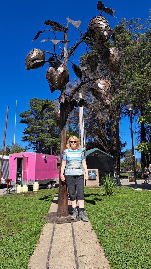 La ciudad es coqueta, con bastantes restaurantes, biergarten y cafés. También se ve la influencia de los artesanos locales. Entre que llevábamos retraso con nuestro plan y que la parte del Cerro Piltriquitrón estaba cerrada por incendio reciente, no hicimos ninguna ruta de senderismo por la zona y nos dedicamos a visitar el mercadillo de artesanía local, callejear por el lugar y disfrutar de los establecimientos de gastronomía.