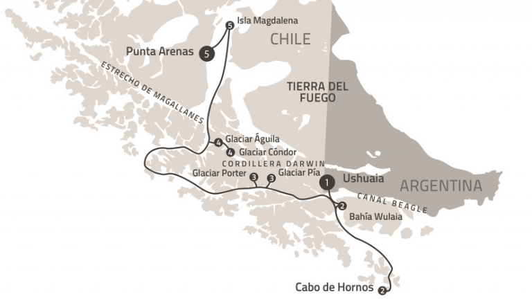 La otra opción que encontramos fue Australis, una empresa chilena que ofrece cruceros de lujo por los fiordos de Tierra del Fuego en dos opciones parecidas, una partiendo de Punta Arenas y llegada a Ushuaia y la otra de Ushuaia a Punta Arenas. Nosotros nos decidimos por la segunda. La ruta está indicada en la foto de cabecera.