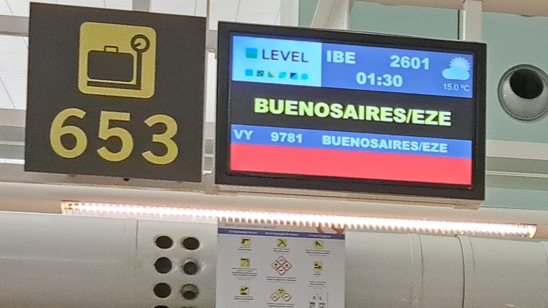 Der Flug nach Buenos Aires startet am 5.1.um 1.30h in der Nacht, um 22h am Vorabend bringt uns Maite zum Flughafen. Nach problemloser Gepäckaufgabe und Passkontrolle beginnt auch schon bald das Einsteigen, der Flieger ist ziemlich voll. Der Service an Bord ist gut, es gibt ein Abendessen und ein Frühstück, zwischendrin auch Wasser und an jedem Sitz eine Medienstation mit Filmen, Musik, etc.